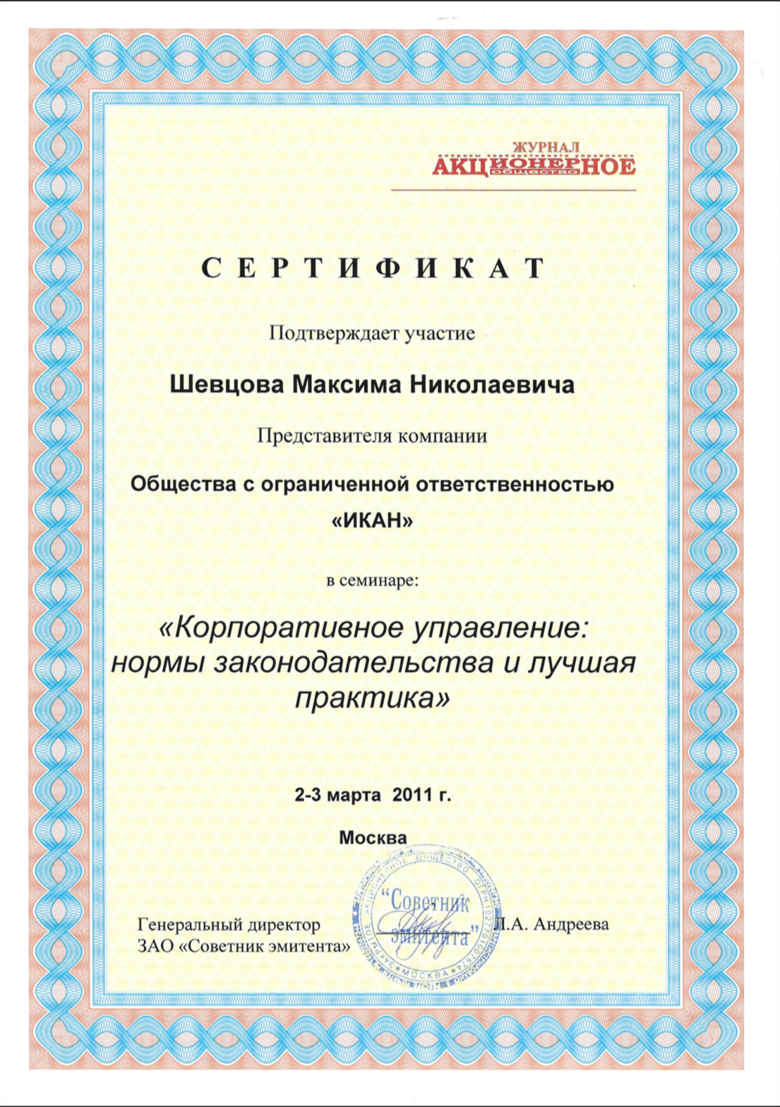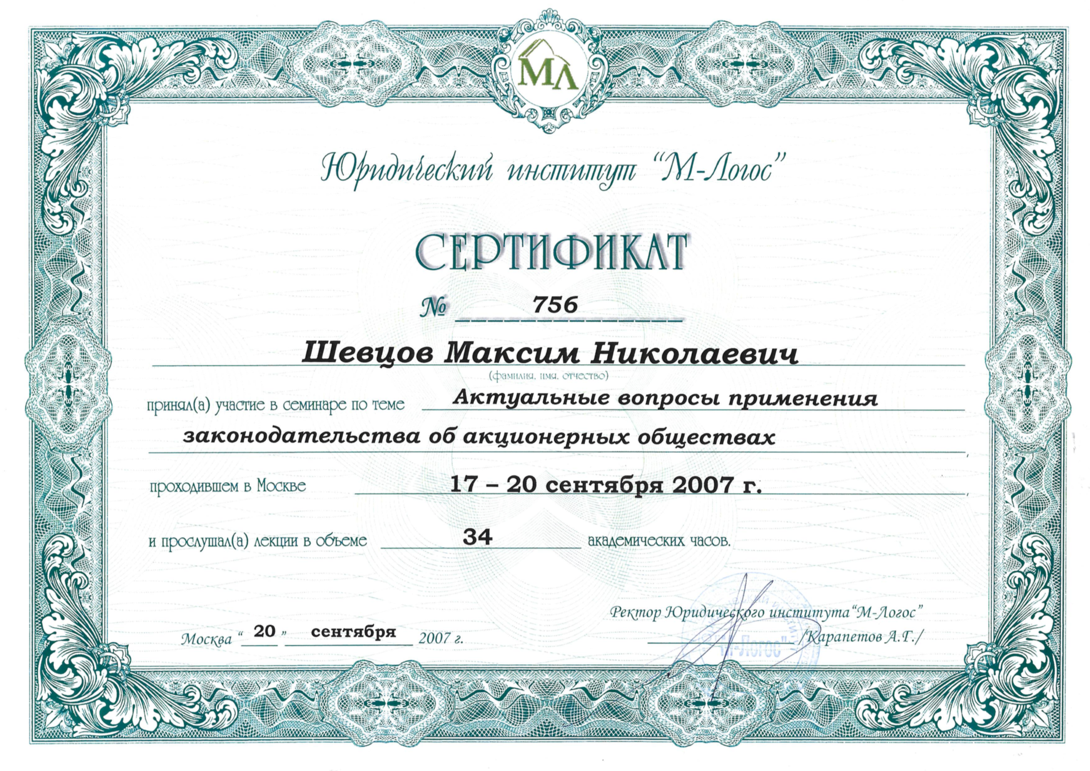 Корпоративное право. Входил в состав Совета директоров предприятия, организовывал проведение общих собраний акционеров